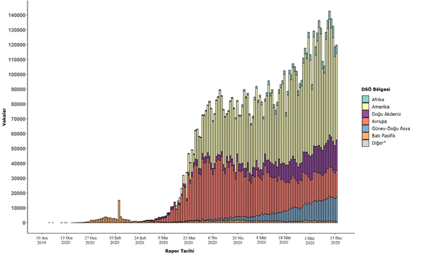 Şekil 2. Rapor tarihi ve DSÖ bölgesine göre doğrulanmış COVID-19 vakalarının sayısı, 30 Aralık 2019 – 17 Haziran 2020**