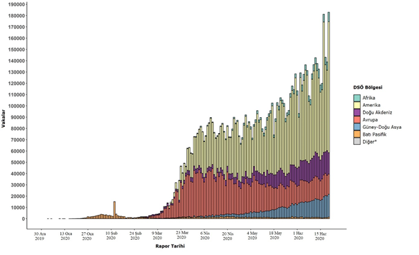 Şekil 2. Rapor tarihi ve DSÖ bölgesine göre doğrulanmış COVID-19 vakalarının sayısı, 30 Aralık 2019 – 21 Haziran 2020**