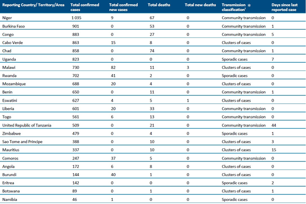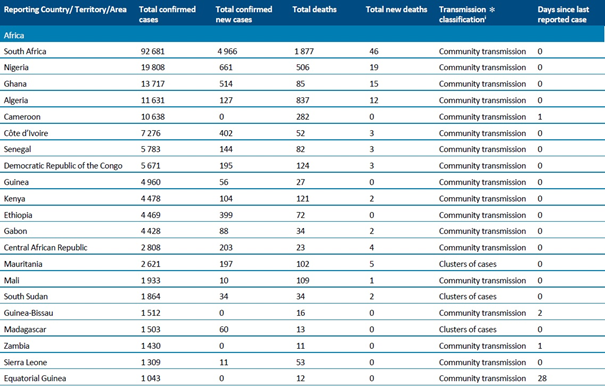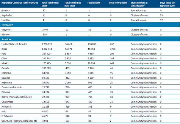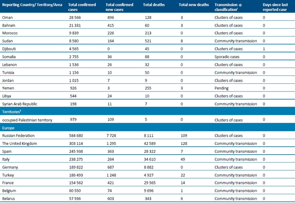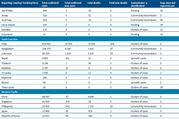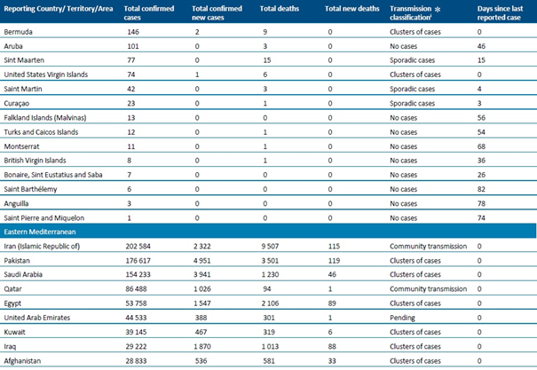 Sayımlar, aksi belirtilmedikçe DSÖ vaka tanımlarına (https://www.who.int/publications-detail/global-surveillance-for-human-infection-with-novel-coronavirus-(2019-ncov) ) dayanarak laboratuvar tarafından onaylanan vakaları ve ölümleri yansıtmakta (bkz. Ülkeye veya bölgeye özgü güncellemeler ve yazım hataları) ve hem ülke içindeki, hem de ülkesine geri gönderilen vakaları içermektedir.