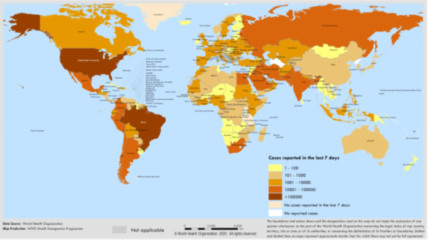 Şekil 1. Son yedi gün içinde, ülke veya bölgeye göre bildirilen doğrulanmış COVID-19 vakası sayısı, 15 Haziran – 21 Haziran **
