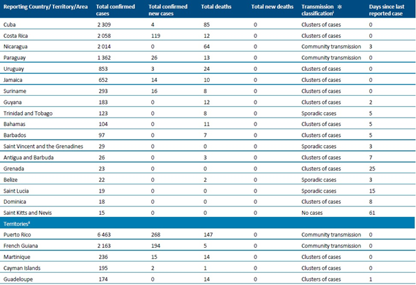 (1) Bulaşma sınıflandırması, ülkelerin/bölgelerin kendilerini raporlama sürecine dayanmaktadır. Sınıflandırmalar, haftalık olarak gözden geçirilmekte ve yeni bilgiler elde edildikçe düzeltilmektedir ve bildirilen en yüksek kategoriye dayanmaktadır. Ülkeler/Bölgeler arasında farklı bulaşma dereceleri olabilir. Kategoriler: