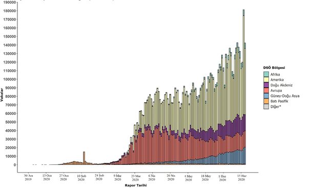 Şekil 2. Rapor tarihi ve DSÖ bölgesine göre doğrulanmış COVID-19 vakalarının sayısı, 30 Aralık 2019 – 19 Haziran 2020**