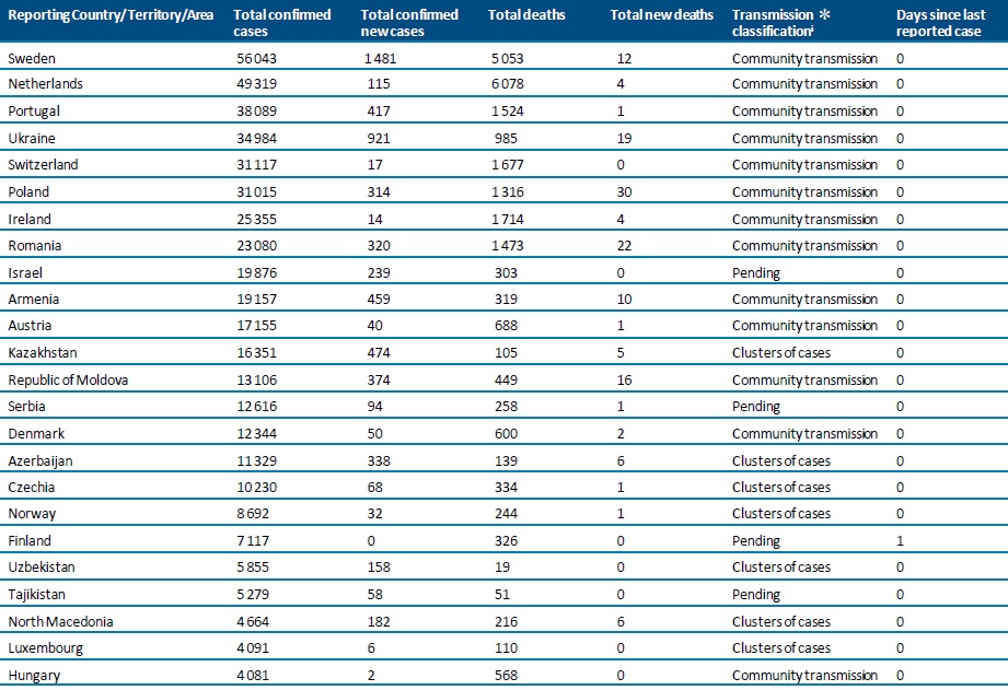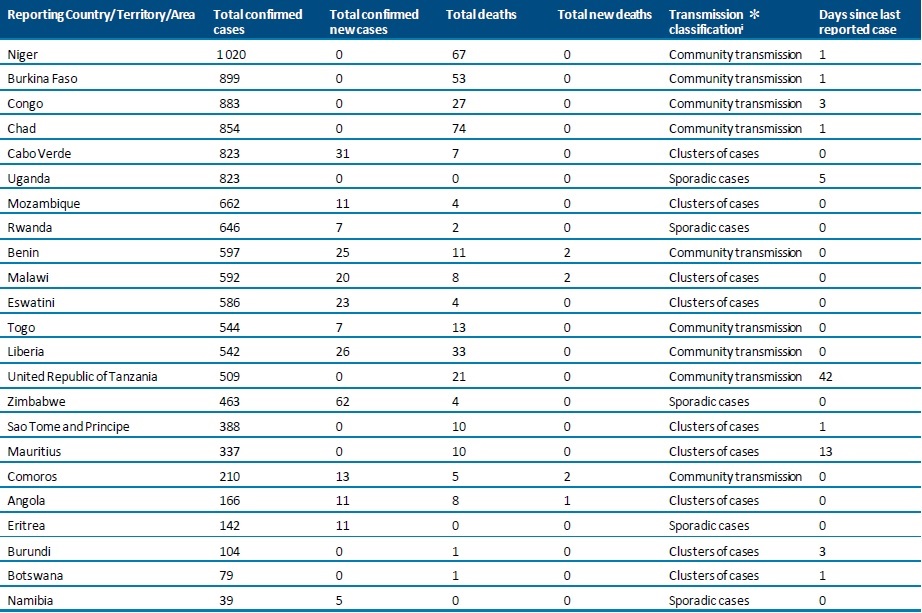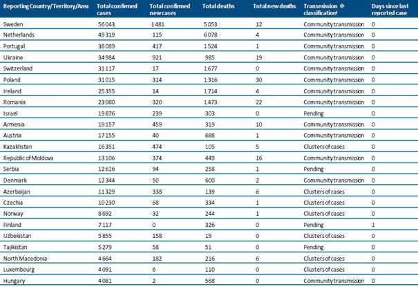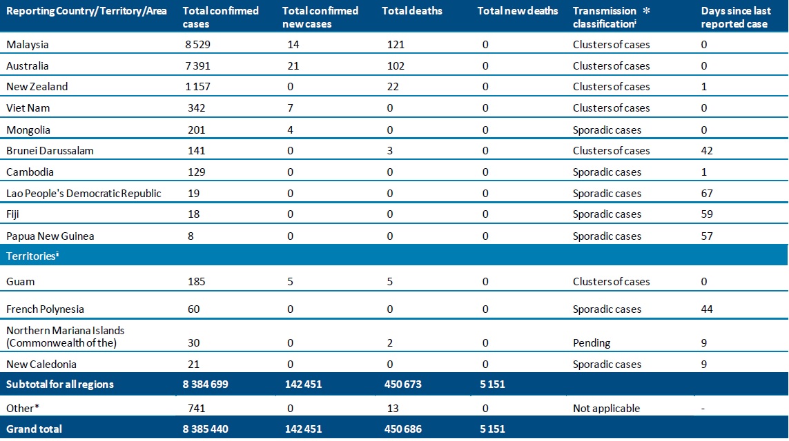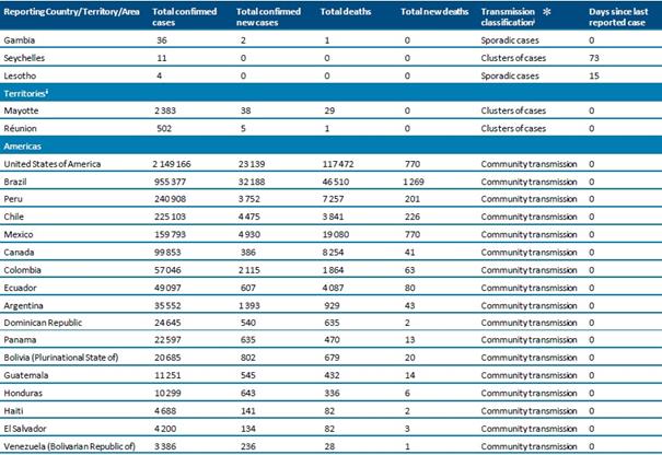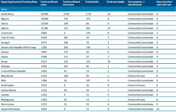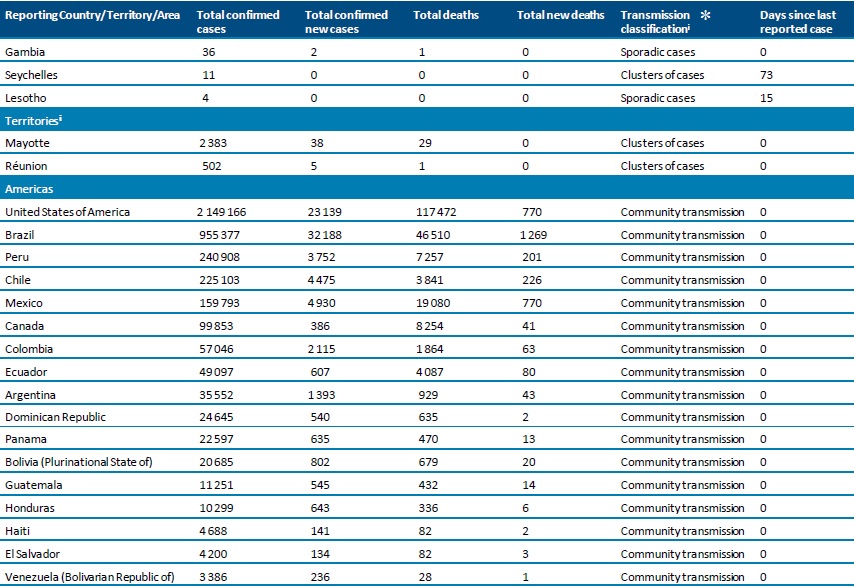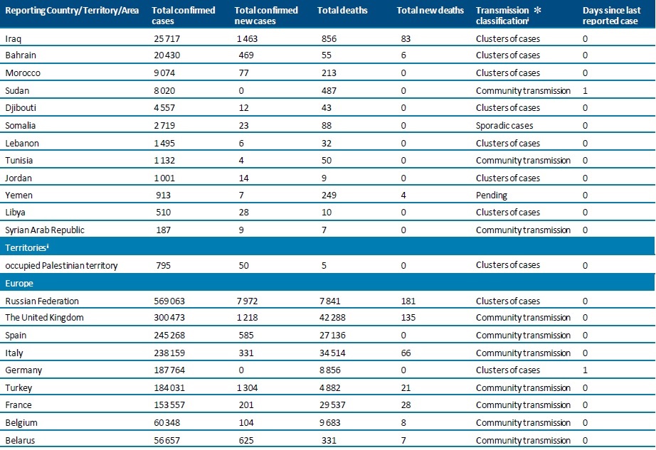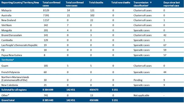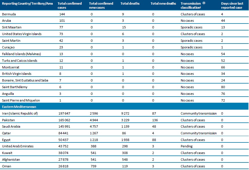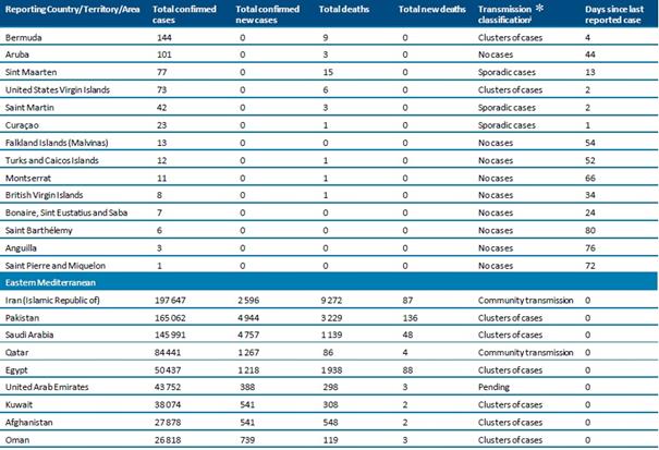 Sayımlar, aksi belirtilmedikçe DSÖ vaka tanımlarına (https://www.who.int/publications-detail/global-surveillance-for-human-infection-with-novel-coronavirus-(2019-ncov) ) dayanarak laboratuvar tarafından onaylanan vakaları ve ölümleri yansıtmakta (bkz. Ülkeye veya bölgeye özgü güncellemeler ve yazım hataları) ve hem ülke içindeki, hem de ülkesine geri gönderilen vakaları içermektedir.