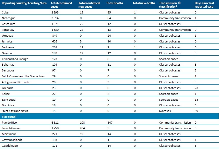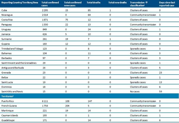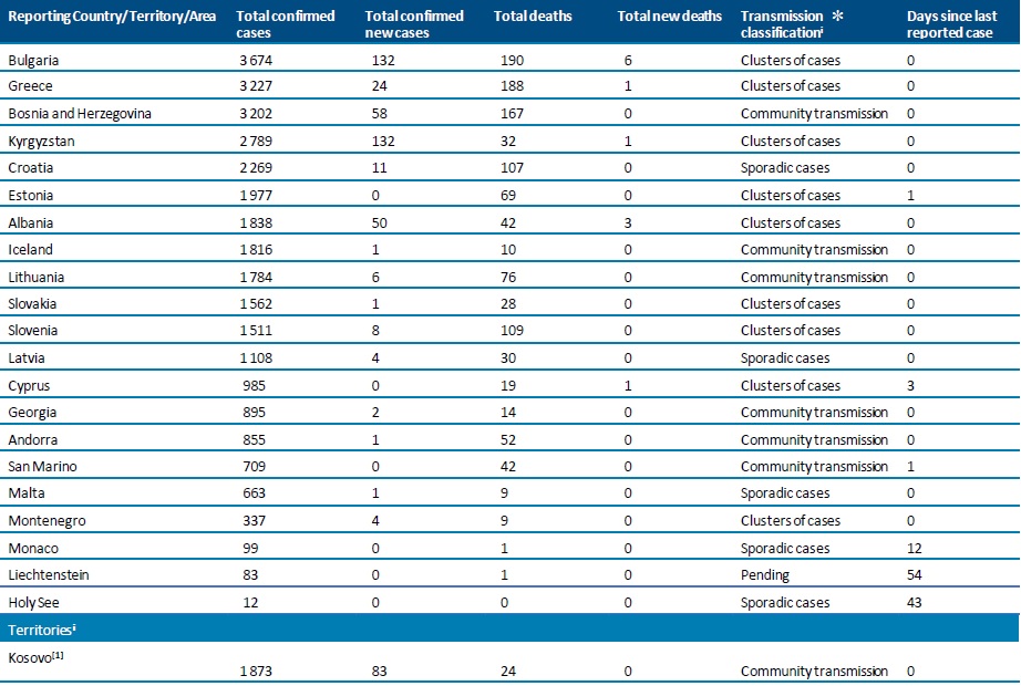 (1) Bulaşma sınıflandırması, ülkelerin/bölgelerin kendilerini raporlama sürecine dayanmaktadır. Sınıflandırmalar, haftalık olarak gözden geçirilmekte ve yeni bilgiler elde edildikçe düzeltilmektedir ve bildirilen en yüksek kategoriye dayanmaktadır. Ülkeler/Bölgeler arasında farklı bulaşma dereceleri olabilir. Kategoriler:
