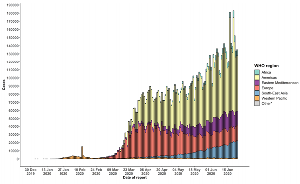 Şekil 2. Rapor tarihi ve DSÖ bölgesine göre doğrulanmış COVID-19 vakalarının sayısı, 30 Aralık 2019 – 24 Haziran 2020**