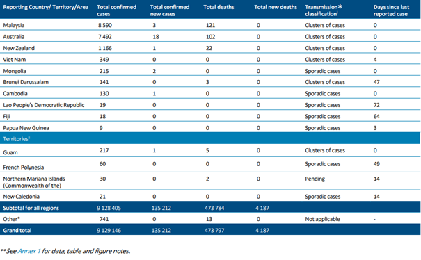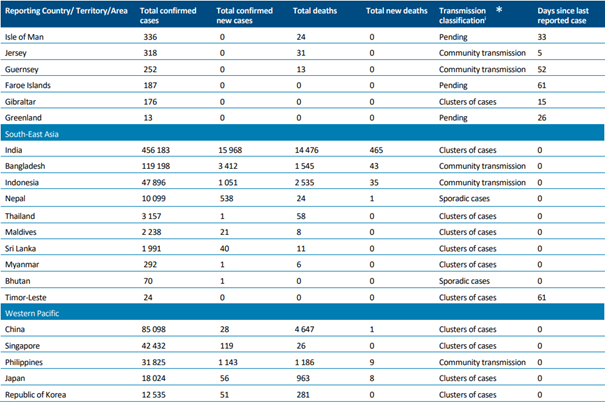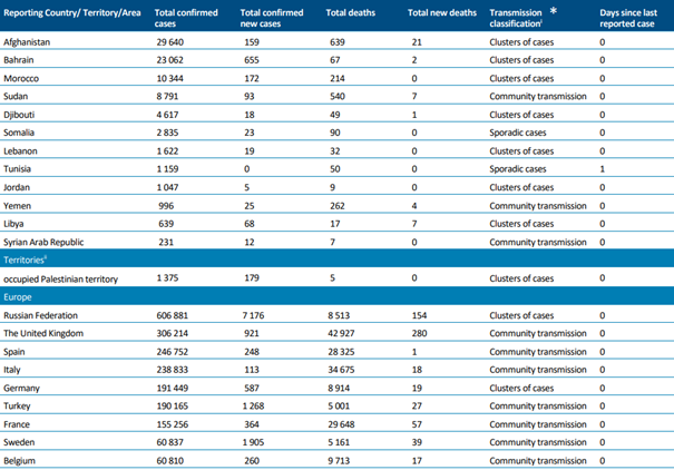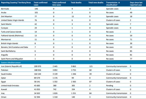 Sayımlar, aksi belirtilmedikçe DSÖ vaka tanımlarına (https://www.who.int/publications-detail/global-surveillance-for-human-infection-with-novel-coronavirus-(2019-ncov) ) dayanarak laboratuvar tarafından onaylanan vakaları ve ölümleri yansıtmakta (bkz. Ülkeye veya bölgeye özgü güncellemeler ve yazım hataları) ve hem ülke içindeki, hem de ülkesine geri gönderilen vakaları içermektedir.