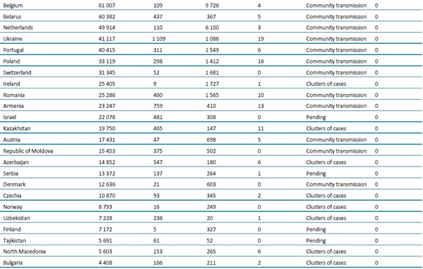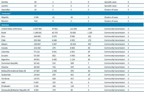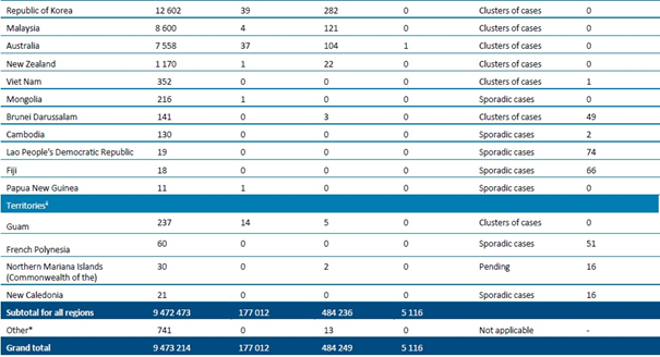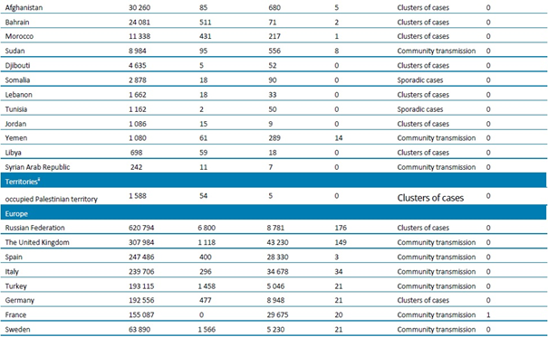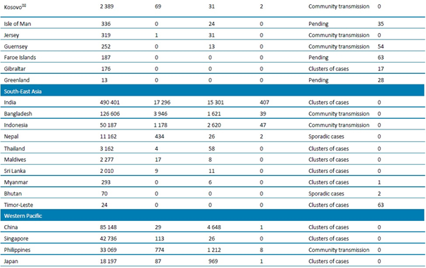 Sayımlar, aksi belirtilmedikçe DSÖ vaka tanımlarına (https://www.who.int/publications-detail/global-surveillance-for-human-infection-with-novel-coronavirus-(2019-ncov) ) dayanarak laboratuvar tarafından onaylanan vakaları ve ölümleri yansıtmakta (bkz. Ülkeye veya bölgeye özgü güncellemeler ve yazım hataları) ve hem ülke içindeki, hem de ülkesine geri gönderilen vakaları içermektedir.
