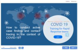 Bu paketin amacı, Ulusal Hızlı Müdahale Ekibi (RRT) üyelerinin COVID-19 salgınını hızlı bir şekilde tespit etmelerini ve salgına etkili bir şekilde müdahale etmelerini sağlamaktır. Paket, öğrencilerin kısa sınavları cevaplamasını ve farklı senaryoları yanıtlamasını sağlayarak, aktif hatırlama yoluyla öğrenmeyi güçlendiren bir dizi etkileşimli modülden oluşmaktadır. COVID-19 hakkındaki en son araçlara ve bilgilere bir giriş sağlamaktadır ve aşağıda listelenen modülleri içermektedir: