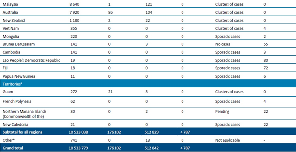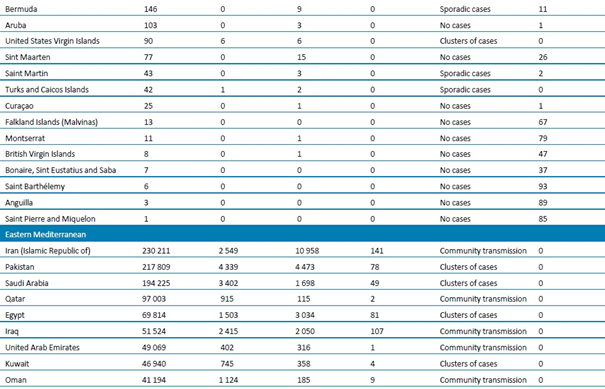 Sayımlar, aksi belirtilmedikçe DSÖ vaka tanımlarına (https://www.who.int/publications-detail/global-surveillance-for-human-infection-with-novel-coronavirus-(2019-ncov) ) dayanarak laboratuvar tarafından onaylanan vakaları ve ölümleri yansıtmakta (bkz. Ülkeye veya bölgeye özgü güncellemeler ve yazım hataları) ve hem ülke içindeki, hem de ülkesine geri gönderilen vakaları içermektedir.