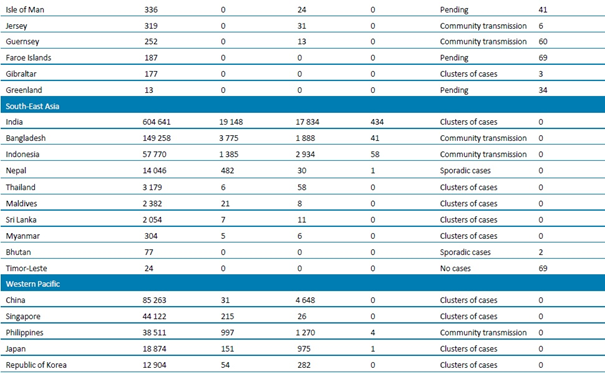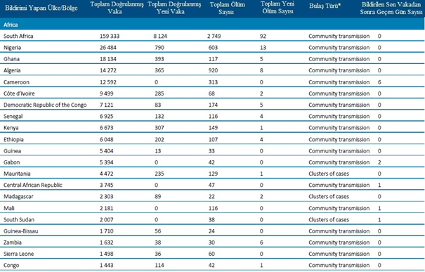 - Beklemede: DSÖ’ye bulaşma sınıflandırmasını henüz rapor etmeyen ülkeler/bölgeler