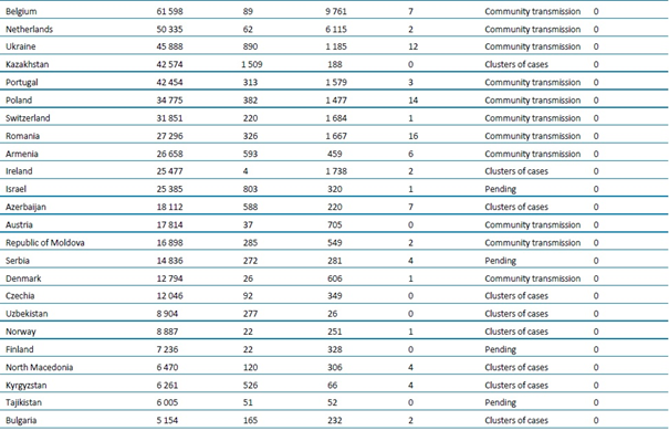 - Sporadik vakalar: İmporte veya yerel olarak tespit edilen bir veya daha fazla vakanın bulunduğu ülkeler/bölgeler