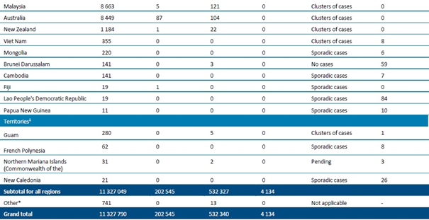Sayımlar, aksi belirtilmedikçe DSÖ vaka tanımlarına (https://www.who.int/publications-detail/global-surveillance-for-human-infection-with-novel-coronavirus-(2019-ncov) ) dayanarak laboratuvar tarafından onaylanan vakaları ve ölümleri yansıtmakta (bkz. Ülkeye veya bölgeye özgü güncellemeler ve yazım hataları) ve hem ülke içindeki, hem de ülkesine geri gönderilen vakaları içermektedir.