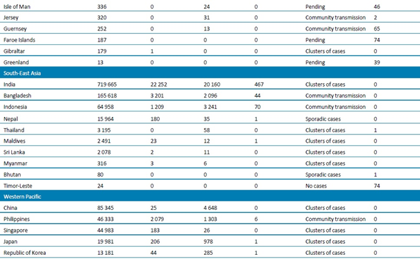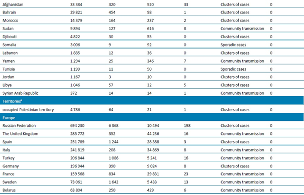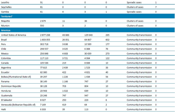 Tablo 1. DSÖ bölgesine göre, laboratuvarda doğrulanmış COVID-19 vakaları ve ölümleri bildirilen ülkeler veya bölgeler. Orta Avrupa Zaman Dilimine göre sabah 10.00 itibarıyla bildirilen veriler, 7 Temmuz 2020**