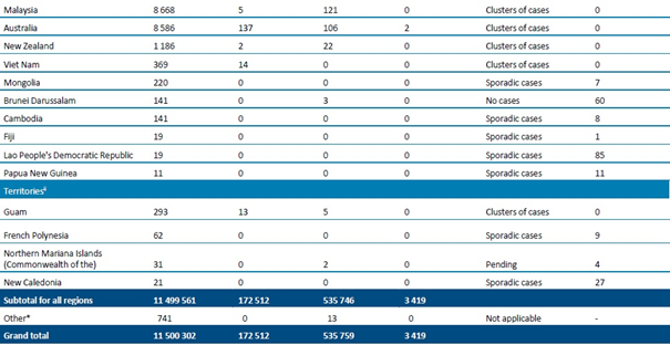 Sayımlar, aksi belirtilmedikçe DSÖ vaka tanımlarına (https://www.who.int/publications-detail/global-surveillance-for-human-infection-with-novel-coronavirus-(2019-ncov) ) dayanarak laboratuvar tarafından onaylanan vakaları ve ölümleri yansıtmakta (bkz. Ülkeye veya bölgeye özgü güncellemeler ve yazım hataları) ve hem ülke içindeki, hem de ülkesine geri gönderilen vakaları içermektedir.