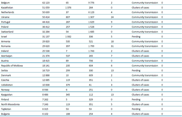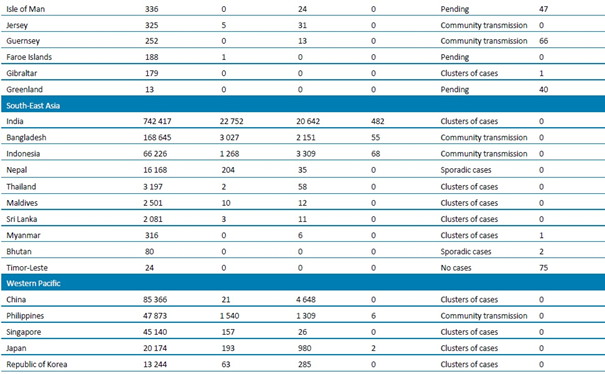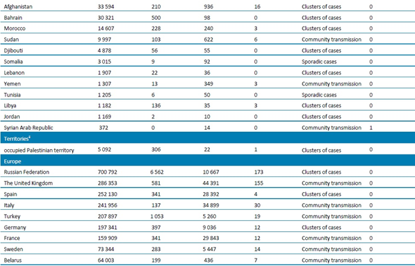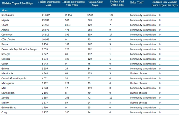 Sayımlar, aksi belirtilmedikçe DSÖ vaka tanımlarına (https://www.who.int/publications-detail/global-surveillance-for-human-infection-with-novel-coronavirus-(2019-ncov) ) dayanarak laboratuvar tarafından onaylanan vakaları ve ölümleri yansıtmakta (bkz. Ülkeye veya bölgeye özgü güncellemeler ve yazım hataları) ve hem ülke içindeki, hem de ülkesine geri gönderilen vakaları içermektedir.
