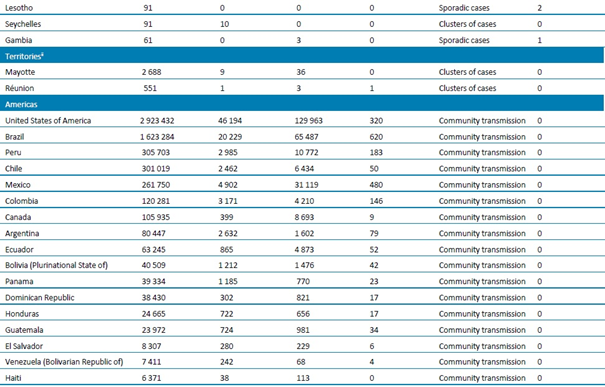 - Amerika bölgesi günde 100.000 COVID-19 vakası rapor ederken, DSÖ Amerika Bölge Ofisi Müdürü Dr. Carissa F. Etienne, ülkeler arasında güçlü bir koordinasyon, liderlerin eylemlerine rehberlik edecek kanıtlar ve insanların kendilerini ve başkalarını korumaları için çağrıda bulunmuştur (https://www.paho.org/en/news/7-7-2020-after-six-months-covid-19-strong-coordination-across-countries-and-evidence-based).