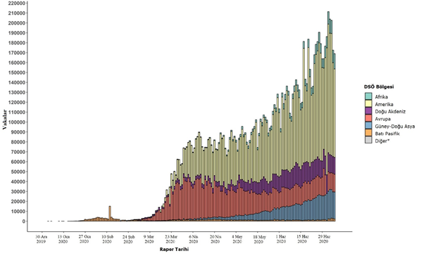 Şekil 2. Rapor tarihi ve DSÖ bölgesine göre doğrulanmış COVID-19 vakalarının sayısı, 30 Aralık 2019 – 8 Temmuz 2020**
