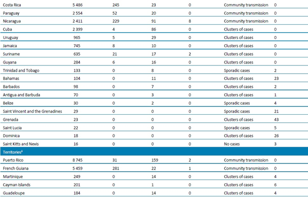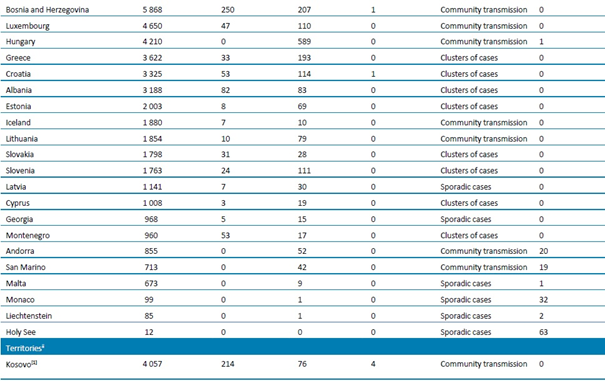 (1) Bulaşma sınıflandırması, ülkelerin/bölgelerin kendilerini raporlama sürecine dayanmaktadır. Sınıflandırmalar, haftalık olarak gözden geçirilmekte ve yeni bilgiler elde edildikçe düzeltilmektedir ve bildirilen en yüksek kategoriye dayanmaktadır. Ülkeler/Bölgeler arasında farklı bulaşma dereceleri olabilir. Kategoriler: