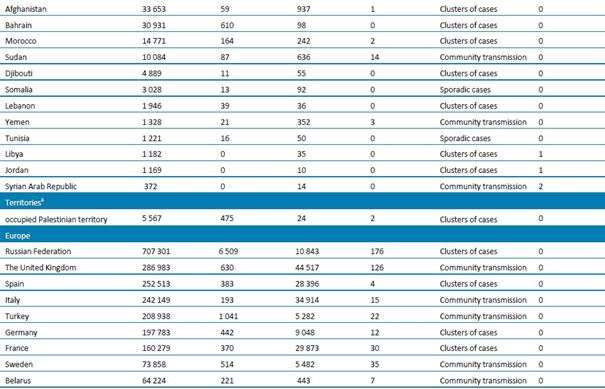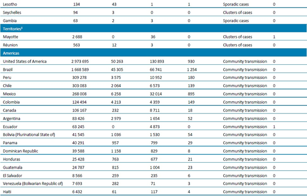 Tablo 1. DSÖ bölgesine göre, laboratuvarda doğrulanmış COVID-19 vakaları ve ölümleri bildirilen ülkeler veya bölgeler. Orta Avrupa Zaman Dilimine göre sabah 10.00 itibarıyla bildirilen veriler, 9 Temmuz 2020**