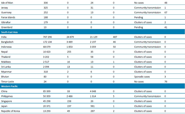 Sayımlar, aksi belirtilmedikçe DSÖ vaka tanımlarına (https://www.who.int/publications-detail/global-surveillance-for-human-infection-with-novel-coronavirus-(2019-ncov) ) dayanarak laboratuvar tarafından onaylanan vakaları ve ölümleri yansıtmakta (bkz. Ülkeye veya bölgeye özgü güncellemeler ve yazım hataları) ve hem ülke içindeki, hem de ülkesine geri gönderilen vakaları içermektedir.