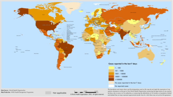 Şekil 1. Son yedi gün içinde, ülke veya bölgeye göre bildirilen doğrulanmış COVID-19 vakası sayısı, 3 – 9 Temmuz **