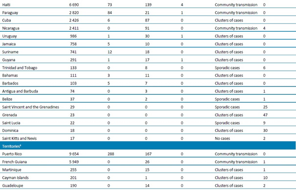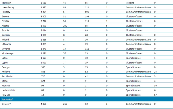 (1) Bulaşma sınıflandırması, ülkelerin/bölgelerin kendilerini raporlama sürecine dayanmaktadır. Sınıflandırmalar, haftalık olarak gözden geçirilmekte ve yeni bilgiler elde edildikçe düzeltilmektedir ve bildirilen en yüksek kategoriye dayanmaktadır. Ülkeler/Bölgeler arasında farklı bulaşma dereceleri olabilir. Kategoriler: