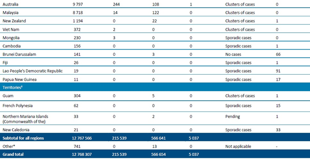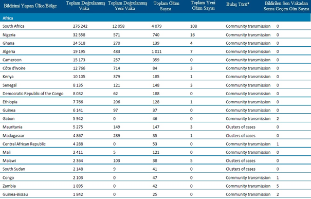 Sayımlar, aksi belirtilmedikçe DSÖ vaka tanımlarına (https://www.who.int/publications-detail/global-surveillance-for-human-infection-with-novel-coronavirus-(2019-ncov) ) dayanarak laboratuvar tarafından onaylanan vakaları ve ölümleri yansıtmakta (bkz. Ülkeye veya bölgeye özgü güncellemeler ve yazım hataları) ve hem ülke içindeki, hem de ülkesine geri gönderilen vakaları içermektedir.
