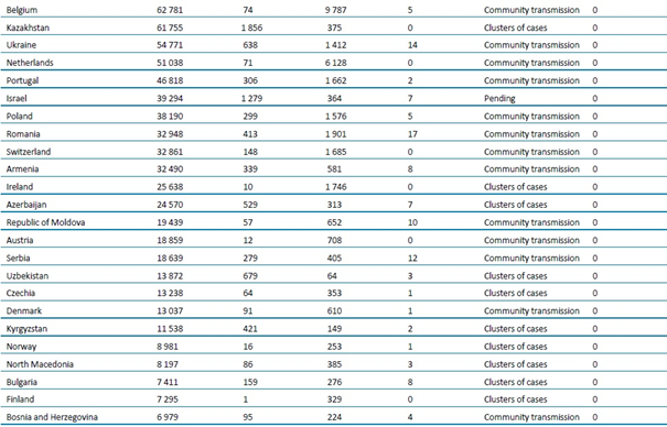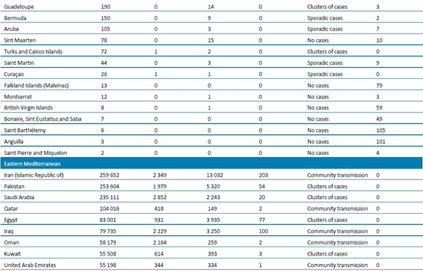 Sayımlar, aksi belirtilmedikçe DSÖ vaka tanımlarına (https://www.who.int/publications-detail/global-surveillance-for-human-infection-with-novel-coronavirus-(2019-ncov) ) dayanarak laboratuvar tarafından onaylanan vakaları ve ölümleri yansıtmakta (bkz. Ülkeye veya bölgeye özgü güncellemeler ve yazım hataları) ve hem ülke içindeki, hem de ülkesine geri gönderilen vakaları içermektedir.