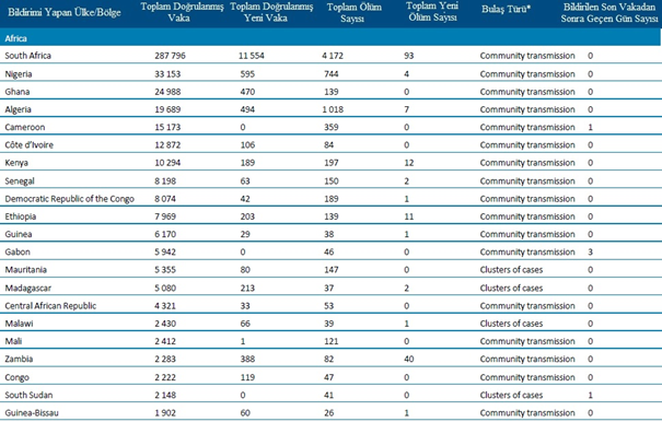 - Beklemede: DSÖ’ye bulaşma sınıflandırmasını henüz rapor etmeyen ülkeler/bölgeler