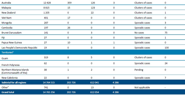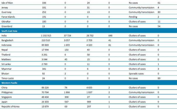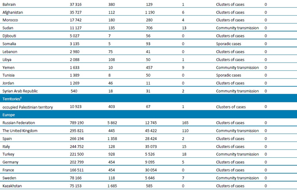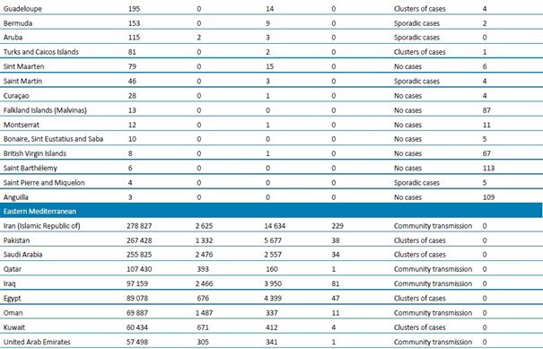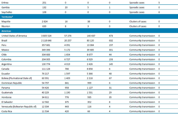 Tablo 1. DSÖ bölgesine göre, laboratuvarda doğrulanmış COVID-19 vakaları ve ölümleri bildirilen ülkeler veya bölgeler. Orta Avrupa Zaman Dilimine göre sabah 10.00 itibarıyla bildirilen veriler, 22 Temmuz 2020**