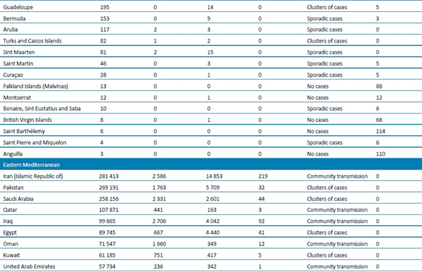 Sayımlar, aksi belirtilmedikçe DSÖ vaka tanımlarına (https://www.who.int/publications-detail/global-surveillance-for-human-infection-with-novel-coronavirus-(2019-ncov) ) dayanarak laboratuvar tarafından onaylanan vakaları ve ölümleri yansıtmakta (bkz. Ülkeye veya bölgeye özgü güncellemeler ve yazım hataları) ve hem ülke içindeki, hem de ülkesine geri gönderilen vakaları içermektedir.