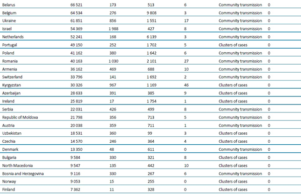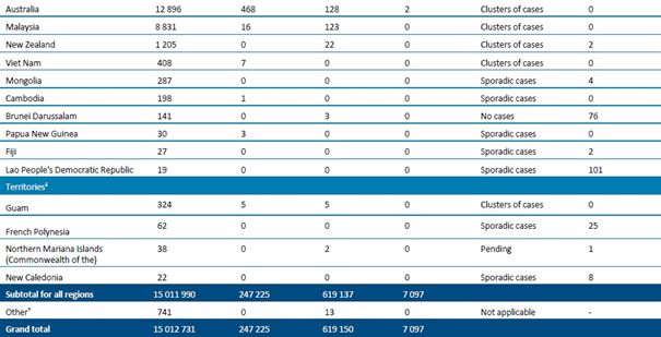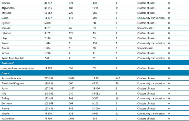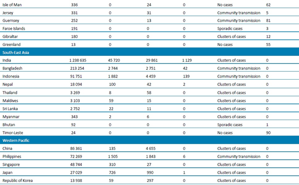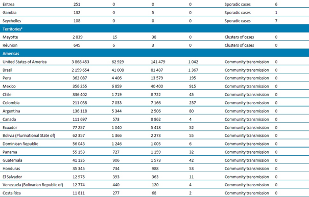Tablo 1. DSÖ bölgesine göre, laboratuvarda doğrulanmış COVID-19 vakaları ve ölümleri bildirilen ülkeler veya bölgeler. Orta Avrupa Zaman Dilimine göre sabah 10.00 itibarıyla bildirilen veriler, 23 Temmuz 2020**