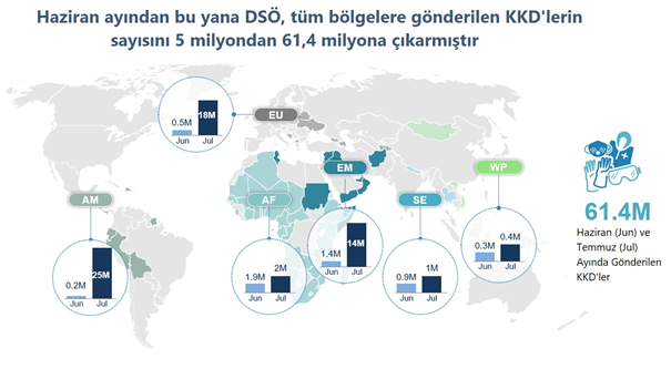 14 Temmuz 2020'den bu yana, DSÖ, 11 milyon adet KKD daha göndermiş ve toplamda 61,4 milyon adet sevk etmiştir (Şekil 2). Depoda 190 milyon adet KKD daha önümüzdeki haftalarda göndermek üzere hazırlanmaktadır.