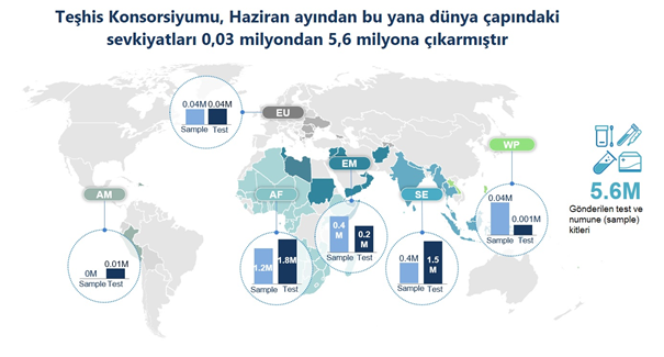 Konsorsiyum aracılığıyla, DSÖ, UNICEF ve Küresel Fon 134 ülkeye tahsis için bugüne kadar 6,5 milyon polimeraz zincir reaksiyonu (PCR) testi ve 5,6 milyon numune toplama kiti tedarik etmiştir (Şekil 1).