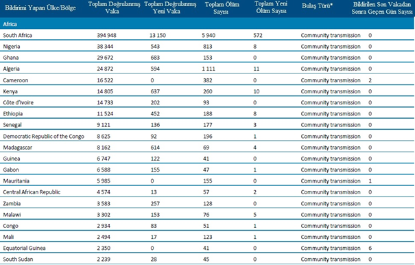 - Beklemede: DSÖ’ye bulaşma sınıflandırmasını henüz rapor etmeyen ülkeler/bölgeler