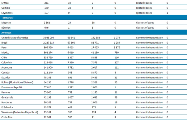 - Güncelleme, 24 Temmuz 2020, Peru: Sayımlar, ulusal makamlar tarafından geriye dönük olarak düzeltilmiştir: 3688 ölüm eklenmiştir.