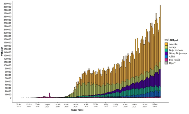 Şekil 2. Rapor tarihi ve DSÖ bölgesine göre doğrulanmış COVID-19 vakalarının sayısı, 30 Aralık 2019 – 24 Temmuz 2020**