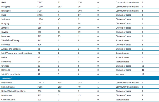 (1) Bulaşma sınıflandırması, ülkelerin/bölgelerin kendilerini raporlama sürecine dayanmaktadır. Sınıflandırmalar, haftalık olarak gözden geçirilmekte ve yeni bilgiler elde edildikçe düzeltilmektedir ve bildirilen en yüksek kategoriye dayanmaktadır. Ülkeler/Bölgeler arasında farklı bulaşma dereceleri olabilir. Kategoriler: