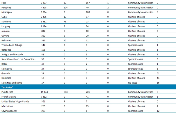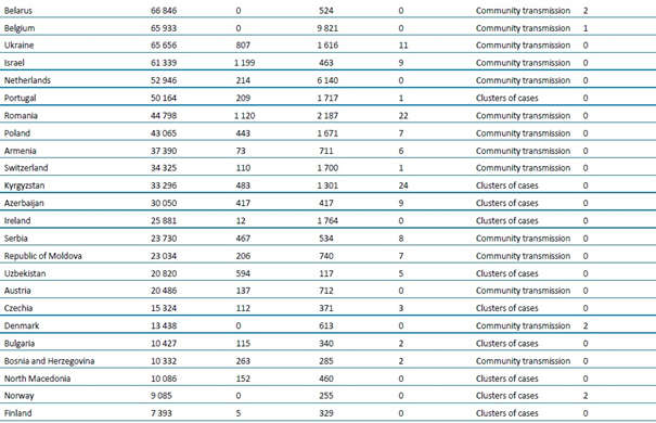 (1) Bulaşma sınıflandırması, ülkelerin/bölgelerin kendilerini raporlama sürecine dayanmaktadır. Sınıflandırmalar, haftalık olarak gözden geçirilmekte ve yeni bilgiler elde edildikçe düzeltilmektedir ve bildirilen en yüksek kategoriye dayanmaktadır. Ülkeler/Bölgeler arasında farklı bulaşma dereceleri olabilir. Kategoriler: