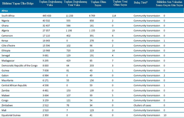 - Beklemede: DSÖ’ye bulaşma sınıflandırmasını henüz rapor etmeyen ülkeler/bölgeler