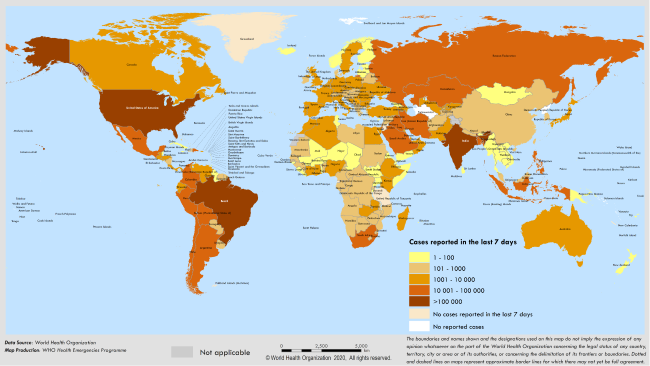 Şekil 1. Son yedi gün içinde, ülke veya bölgeye göre bildirilen doğrulanmış COVID-19 vakası sayısı, 21 – 27 Temmuz **