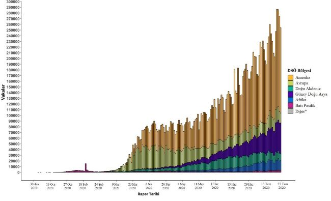 Şekil 2. Rapor tarihi ve DSÖ bölgesine göre doğrulanmış COVID-19 vakalarının sayısı, 30 Aralık 2019 – 27 Temmuz 2020**