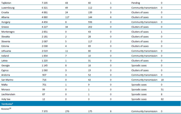(1) Bulaşma sınıflandırması, ülkelerin/bölgelerin kendilerini raporlama sürecine dayanmaktadır. Sınıflandırmalar, haftalık olarak gözden geçirilmekte ve yeni bilgiler elde edildikçe düzeltilmektedir ve bildirilen en yüksek kategoriye dayanmaktadır. Ülkeler/Bölgeler arasında farklı bulaşma dereceleri olabilir. Kategoriler:
