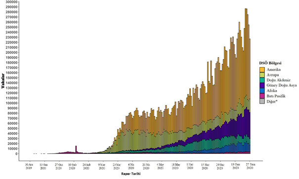 Şekil 3. Rapor tarihi ve DSÖ bölgesine göre doğrulanmış COVID-19 vakalarının sayısı, 30 Aralık 2019 – 28 Temmuz 2020**