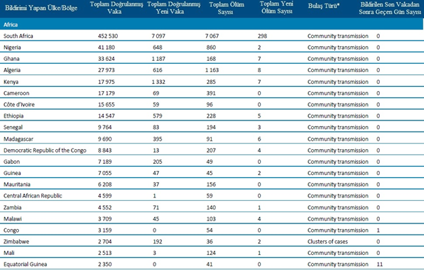 - Beklemede: DSÖ’ye bulaşma sınıflandırmasını henüz rapor etmeyen ülkeler/bölgeler