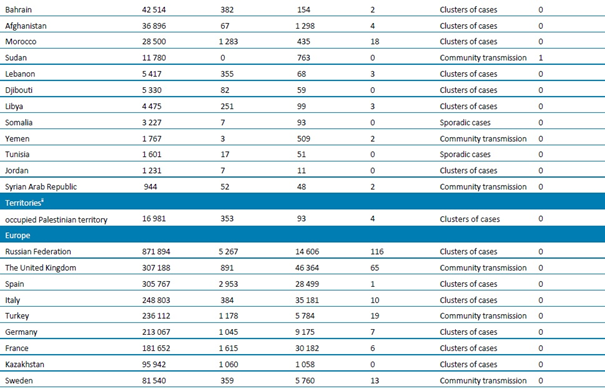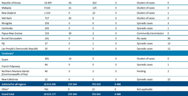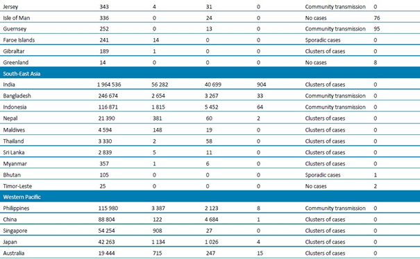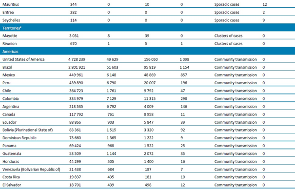 Tablo 1. DSÖ bölgesine göre, laboratuvarda doğrulanmış COVID-19 vakaları ve ölümleri bildirilen ülkeler veya bölgeler. Orta Avrupa Zaman Dilimine göre sabah 10.00 itibarıyla bildirilen veriler, 6 Ağustos 2020**