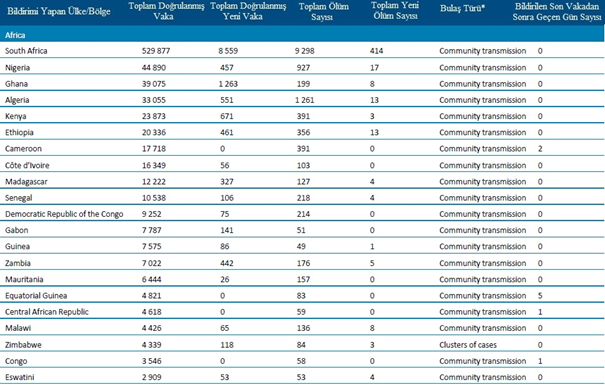 - Beklemede: DSÖ’ye bulaşma sınıflandırmasını henüz rapor etmeyen ülkeler/bölgeler