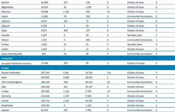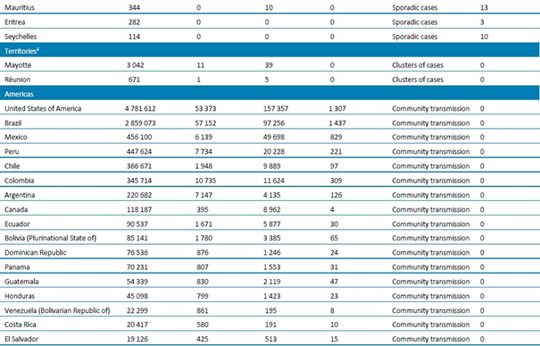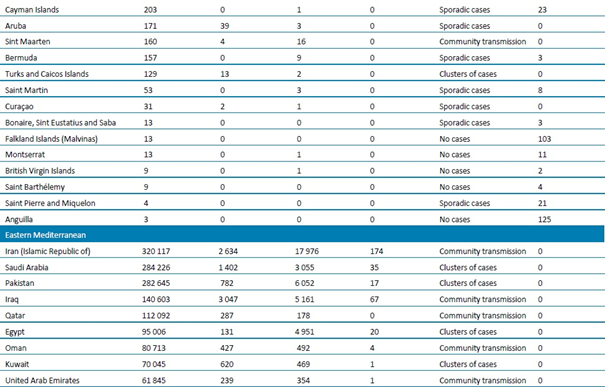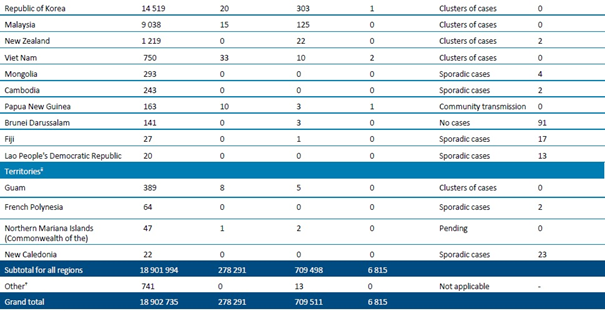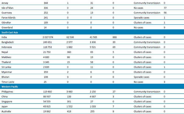 Tablo 1. DSÖ bölgesine göre, laboratuvarda doğrulanmış COVID-19 vakaları ve ölümleri bildirilen ülkeler veya bölgeler. Orta Avrupa Zaman Dilimine göre sabah 10.00 itibarıyla bildirilen veriler, 7 Ağustos 2020**