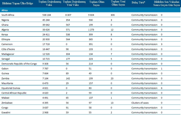 - Beklemede: DSÖ’ye bulaşma sınıflandırmasını henüz rapor etmeyen ülkeler/bölgeler