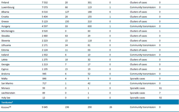 - Güncelleme, 7 Ağustos 2020, Karadağ: Sayımlar ulusal yetkililer tarafından geriye dönük olarak düzenlenmiştir: 28 Temmuz'dan 6 Ağustos'a olan vakaların sayıları, 29 Temmuz'dan 6 Ağustos'a olan ölümlerin sayıları düzenlenmiştir.